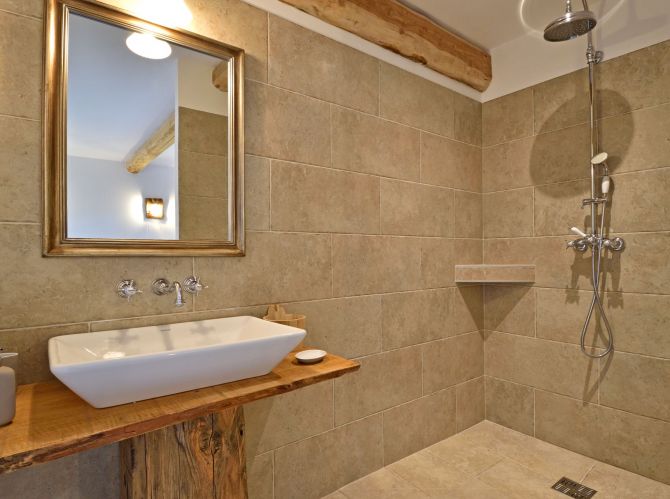 2 chambres pouvant accueillir 4/5 personnes avec une salle de bain par chambre, douche à l'italienne de 120x120 et poutres apparentes.