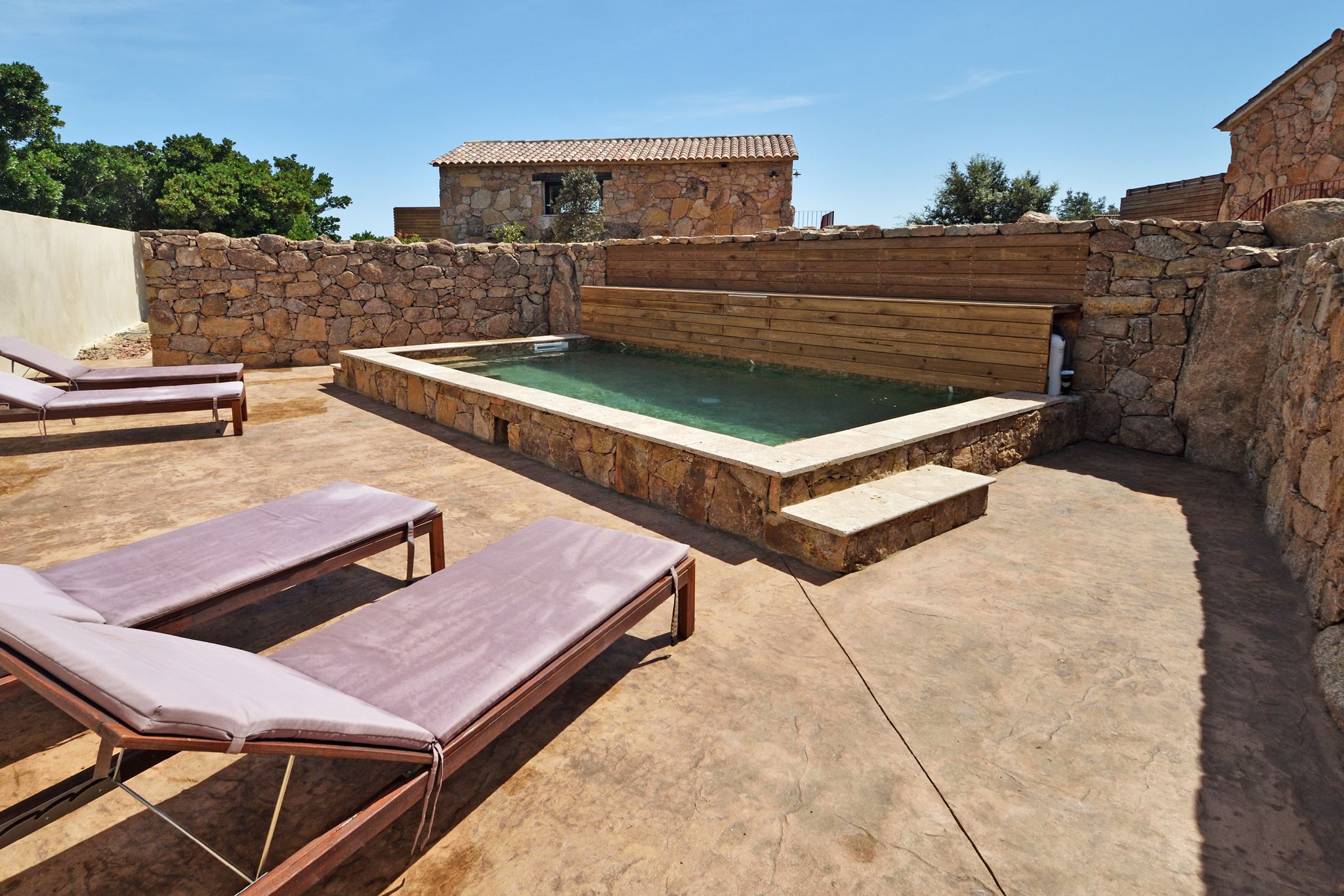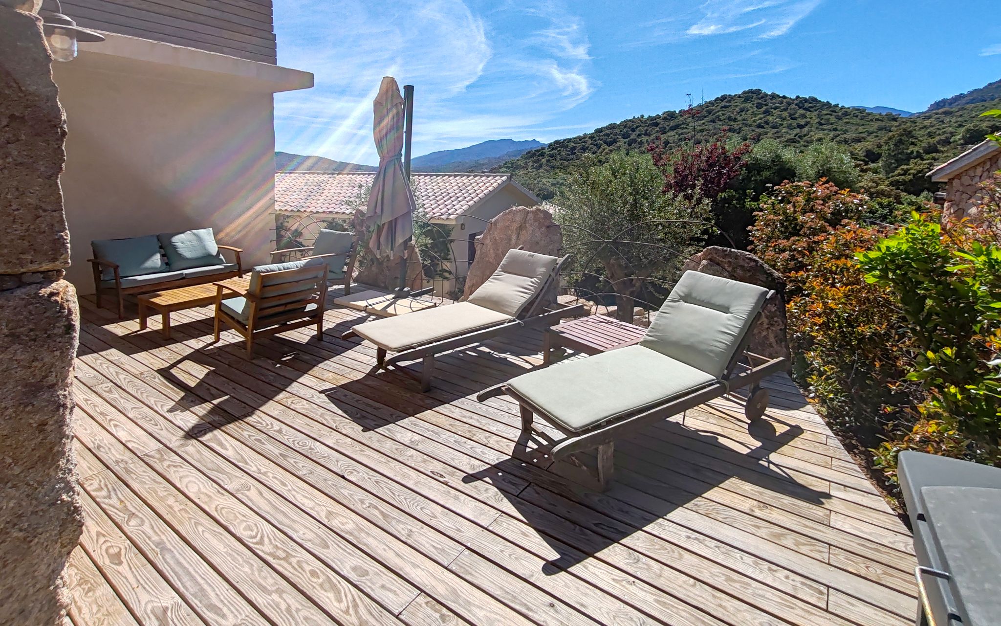 Au pied d'une magnifique et imposante bâtisse en pierre, bénéficiant d'une grande terrasse en bois avec pergola en châtaignier, bains de soleil, salon de jardin, coin plancha/barbecue et coin repas, vous pourrez profiter d'un décor composé de rocher, d'arbre et de plantes endémiques de Corse et de Méditerranée.